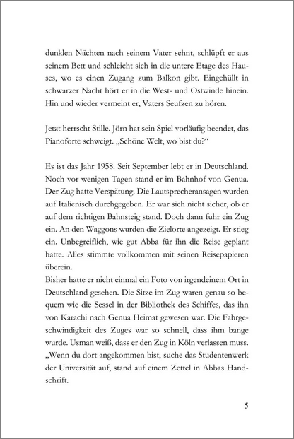 Usman, der Protagonist der Erzählung, wird 1941 in einem kleinen Ort Nordindiens geboren. Ins Deutsche übersetzt, bedeutet sein Name: Trappenküken. Wenige Menschen, Tiere und Pflanzen teilen mit ihm das Leben in einer für ihn unerschütterlichen Geborgenheit. 1947 erfährt Usmans Mikrokosmos tiefgreifende Risse. Sein jüngerer Bruder Fahim stirbt, der Subkontinent wird geteilt. Der Teilung folgt die Vertreibung seiner Familie. Die traumatische Flucht nach Lahore prägt fortan seine Wahrnehmungen. Während in Lahore die Rufe „Allah hu Akbar“ die Luft erschüttern, erlebt er Bilder der Entwürdigung von Menschen und Tieren. Seine Verstörtheit wird immer offensichtlicher. Die Eltern entscheiden, Usman nach Deutschland zu schicken. Dort soll er studieren, möglichst Frieden finden. 1958 kommt er in Deutschland an. Er wohnt bei Frau Schüler. Sie vermittelt ihm ein Gefühl, als wäre er zurück im Garten seiner Kindheit.