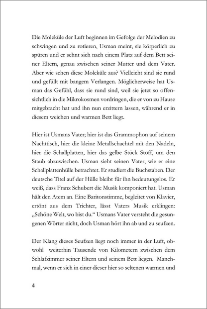 Usman besucht ein Abendgymnasium. Er beginnt, die europäische Kultur und die deutsche Sprache als eine Heimat zu entdecken. Doch auch diese Heimat gerät ins Wanken. Sein Geschichtslehrer zeigt eines Tages einen Schwarzweiß-Film: Ein Bulldozer schiebt die bis auf die Knochen abgemagerten Körper toter Menschen vor sich her. Im Wörterbuch findet er eine Übersetzung für Auschwitz nicht. Er beendet das Studium. Die Perspektive, lebenslang als Chemiker zu arbeiten, ängstigt ihn. In einer Wochenzeitung entdeckt er eine Stellenanzeige. Eine Privatschule mit Internat sucht einen Chemielehrer. Die Schule nennt sich Reformpädagogisch, verspricht eine Erziehung zur Humanität. Über Nacht wird er Pädagoge und Heimerzieher. Die Zusammenarbeit mit Kindern erlebt er als eine Herausforderung. Endlich fühlt er sich in der Welt angekommen. Doch der Schein trügt. Bald entdeckt er, dass die Schulwirklichkeit von Regellosigkeit geprägt ist. Dennoch wähnt er sich in einer wundersamen Welt aufgehoben.